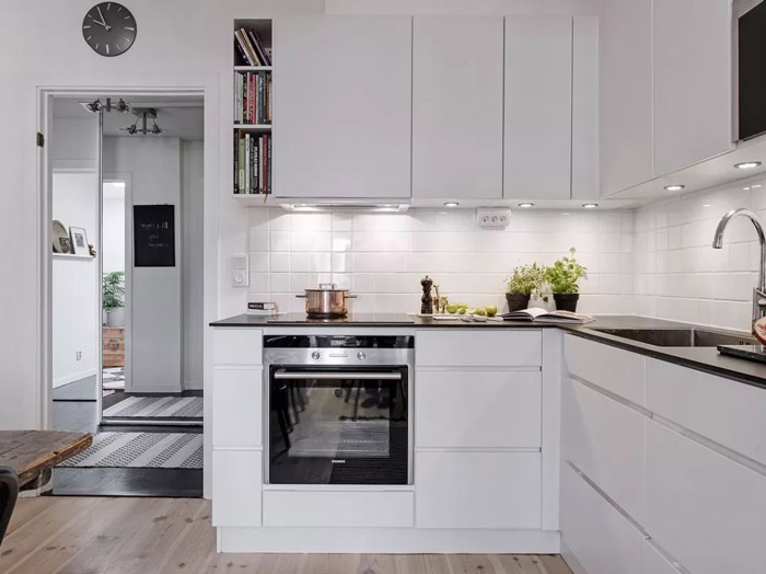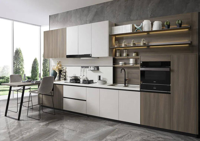 如果有宽敞的厨房及墙面,则可以设置高柜来增加方便分层分类的储物空间,常见的规划方式,可分成层板收纳、内抽收纳以及侧拉收纳。