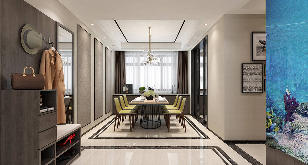 本案以现代港式风格设计,进门的鱼缸在静止的空间中平添了一份灵动靓丽的风景线。